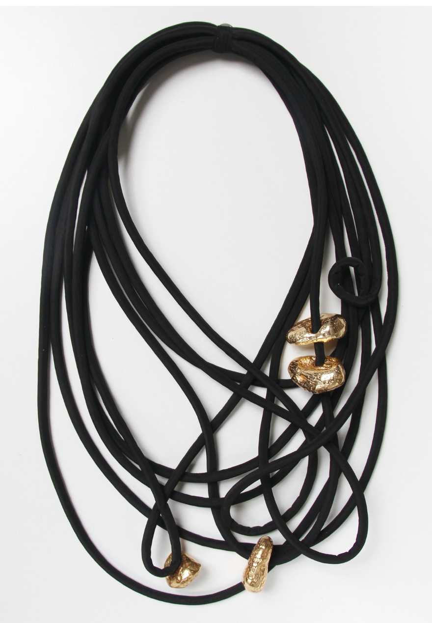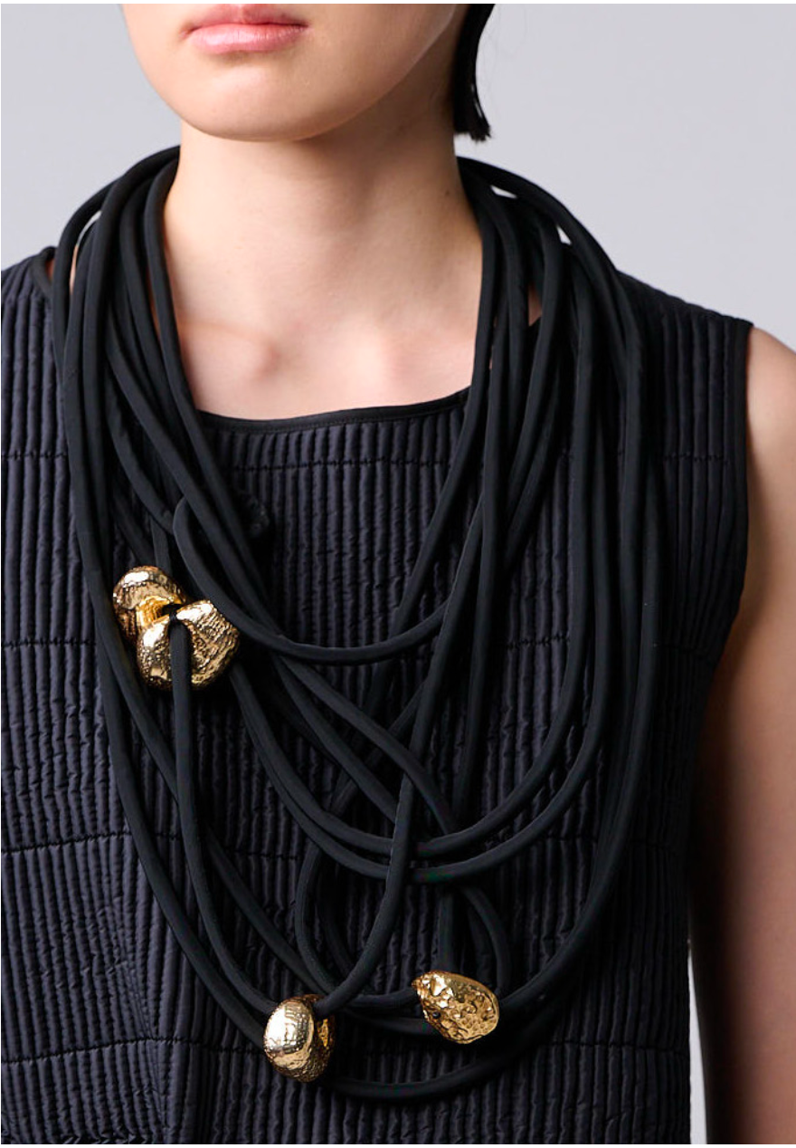- Padded black matte taffeta tubular, with 3 resin gold nuggets, each hand-finished and coated in 24k gold leaf.
