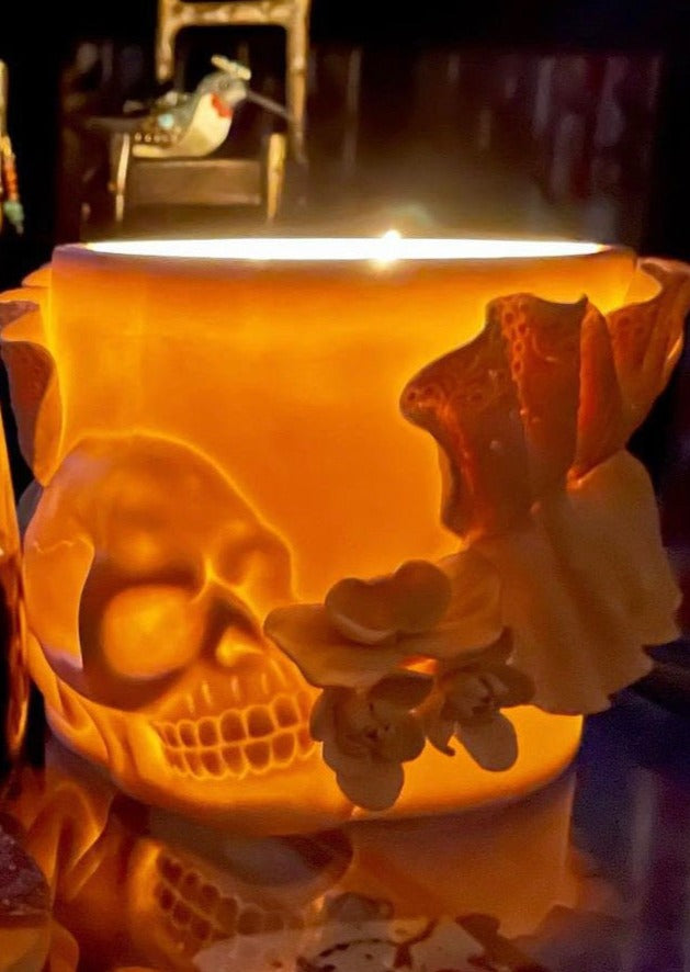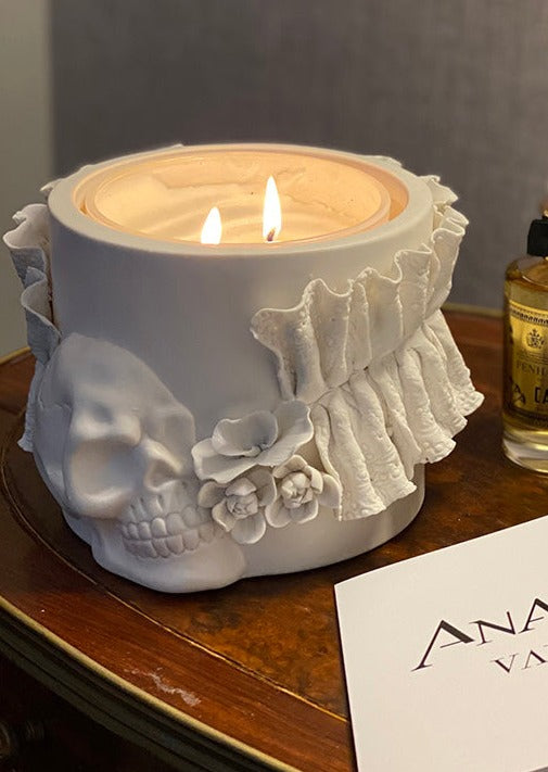 Early Renaissance masters used skulls and weathered flowers to remind us of our mortality, which spurred an art movement called Vanitas. This handcrafted porcelain vessel features a human skull, vintage lace, and florals that represent the convergence of art, fashion, and the science of perfumery.