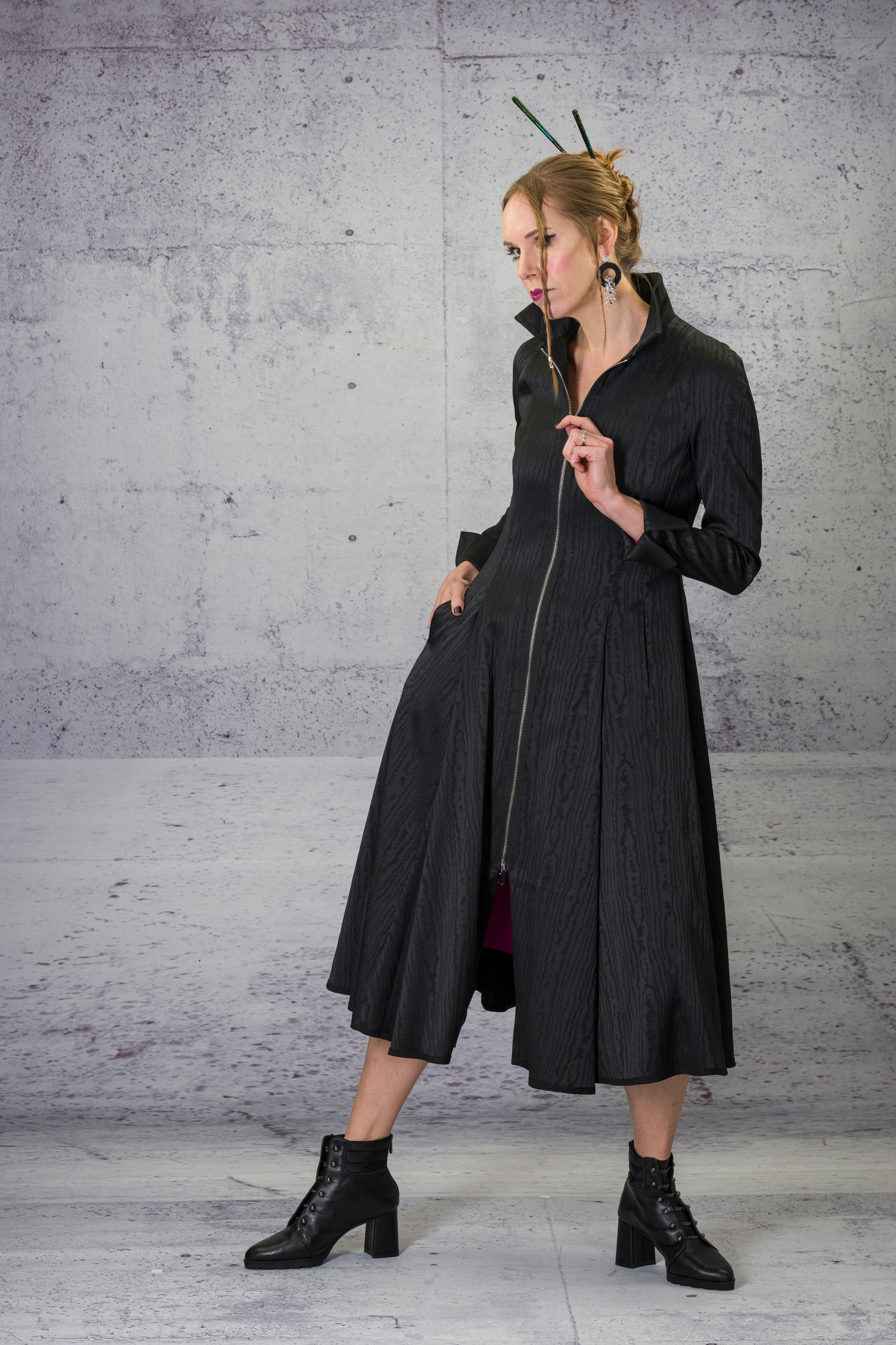 - Top to bottom, double sided zipper. Side pockets